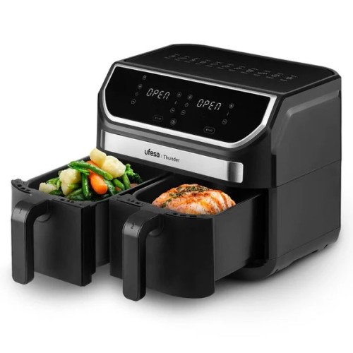 La freidora de aire Ufesa Thunder Digital con doble cubeta es la solución perfecta para preparar comidas deliciosas, rápidas y saludables. Con una impresionante capacidad total de 9 litros dividida en dos cubetas independientes, te permite cocinar diferentes alimentos simultáneamente sin mezclar sabores. Su tecnología de aire caliente circulante garantiza una cocción uniforme con un 85% menos de grasa que los métodos tradicionales.