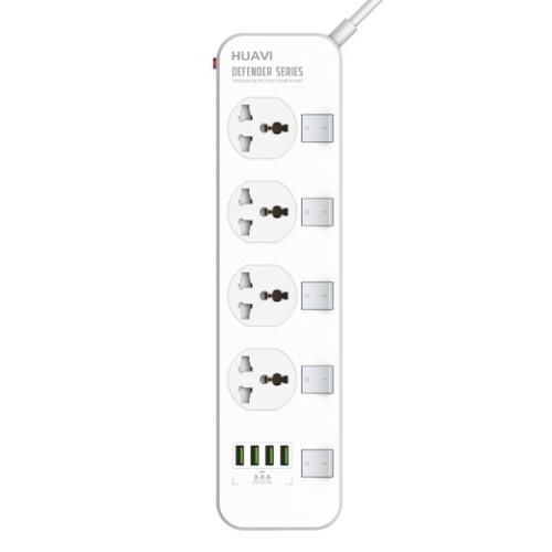 Regleta de cuatro enchufes y cuatro puertos USB con tecnología AUTO-ID de 2,4A, botones de encendido en cada toma con 2 metros de largo. Los 4 enchufes son compatibles para cables redondos y planos. Los 4 puertos son compatibles con cables Micro B, lightning y Tipo C.