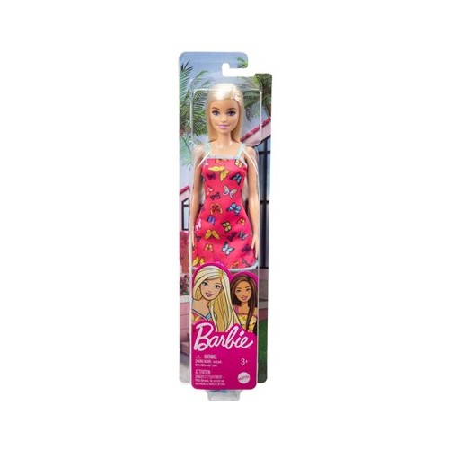 Con un vestido estampado de mariposas de colores y el logo de Barbie® con un par de tacones de tiras, la muñeca Barbie® realmente hace una declaración de estilo.