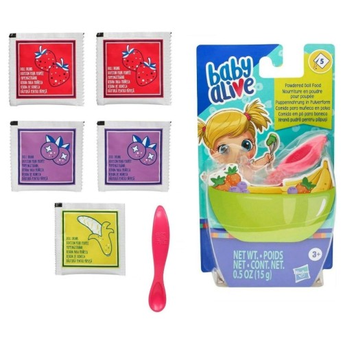 Este paquete de 5 comidas en polvo para muñecas con cucharita es el complemento perfecto para cualquier compra de muñeca Baby Alive que come comida en polvo (muñecas se venden por separado, sujeto a disponibilidad).